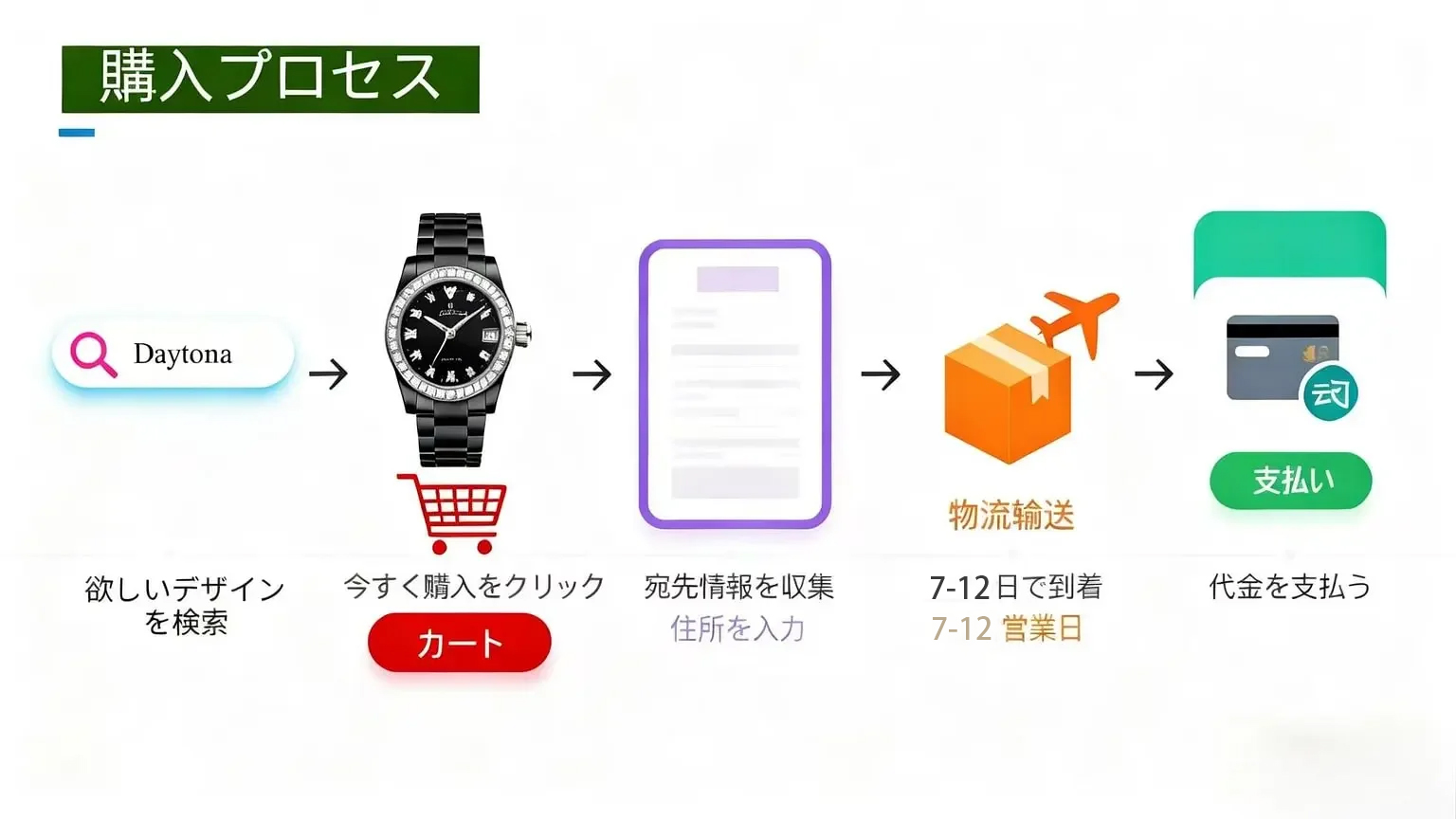 ご購入いただいた商品にご満足いただけない場合は、ご購入時の梱包箱をご使用の上、すぐにご返品いただけます。ただし、消耗、お客様による時計の損傷、設定変更時のリューズやその他のボタン/プッシュロッドの不適切な操作による不具合は、返品の対象外となります。