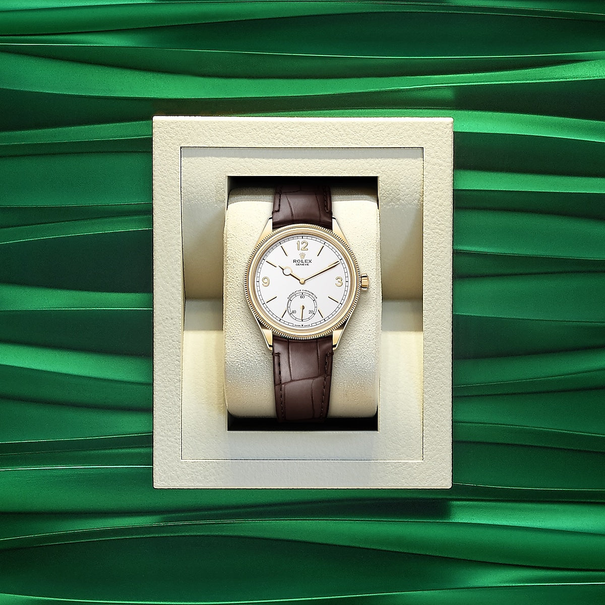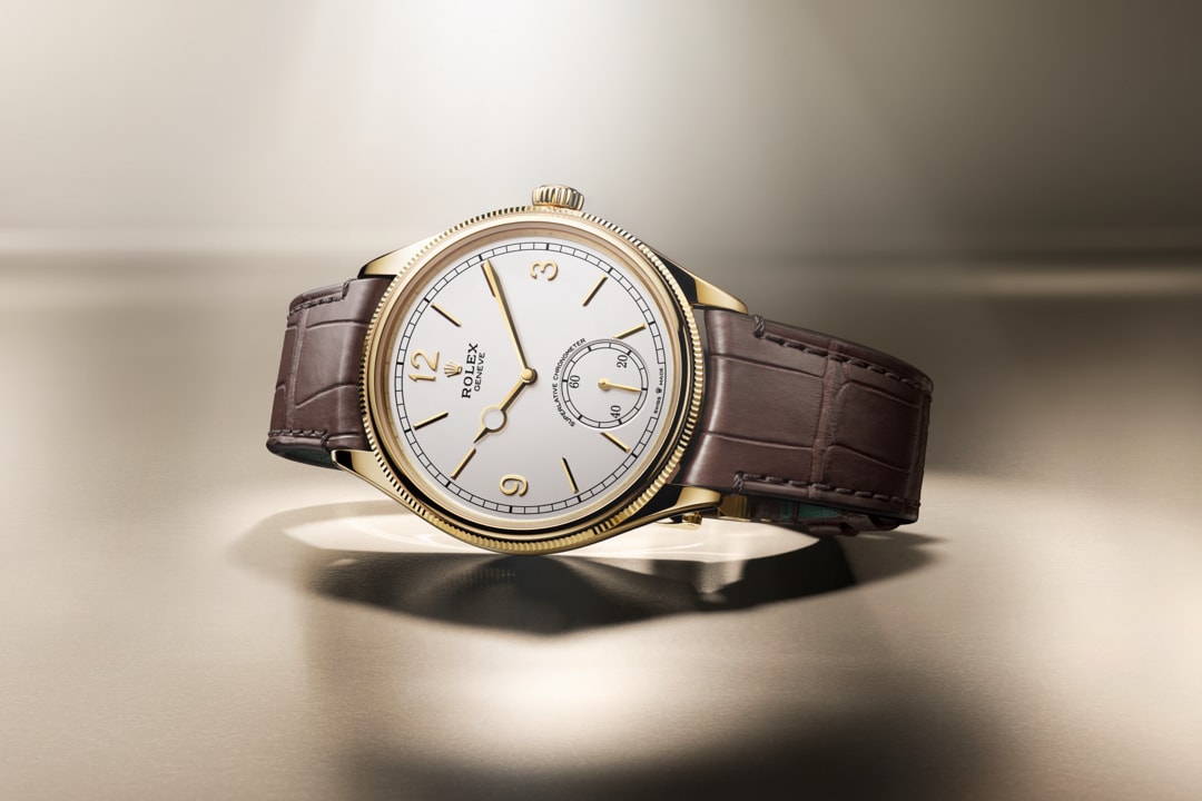 Unworn watch Rolex Perpetual 1908. 39mm. 18k Yellow Gold. Ref# 52508-0006. Striving for the highest level of quality to achieve flawless. long-lasting results is the life philosophy of Rolex. It is in this vein that the global brand has developed a classic collection of watches with a new name and a new look. modestly dressy. ideal for a business suit - Rolex Perpetual 1908. Paying homage to the year in which the Rolex lettering first appeared on the dials. the entire Perpetual 1908 model inspired by the watchmaker's first creation to feature a self-winding rotor. Proof of this is the stunning Intense White dial with superbly long and narrow 18k Yellow Gold applied indexes and Arabic numerals at 12. 3 and 9 o'clock. At 6 o'clock is a small seconds dial. sportier than you might expect. with 20. 40 and 60 on the track. An elegant sword-shaped minute hand with a classic hour hand marked with a ring at the tip. made of 18k Yellow Gold. A well-readable minute scale is applied along the outer contour of the dial. All this charm is complemented by a ribbed. for a comfortable grip. domed screw-down crown in 18k Yellow Gold with the Rolex logo.? The dial is covered with a scratch-resistant sapphire crystal. The highlight of the model is the two-tiered 18k Yellow Gold bezel with a convex and tactile upper part and a characteristic grooved lower part. The model is powered by the in-house automatic Rolex mechanical movement caliber 7140. new 2023. contains 38 jewels and has an approximate power reserve of approximately 66 hours. The mesmerizing work of the mechanism can be seen through the transparent case back. This impressive watch is presented on a matte brown alligator leather strap with green lining and tone-on-tone stitching. custom made for this model. It is fitted with an 18k Yellow Gold Dualclasp folding clasp. Thanks to its carefully shaped design. the Dualclasp is always centered on the wrist for maximum comfort. Water resistant up to 50m/165ft (5 ATM).
